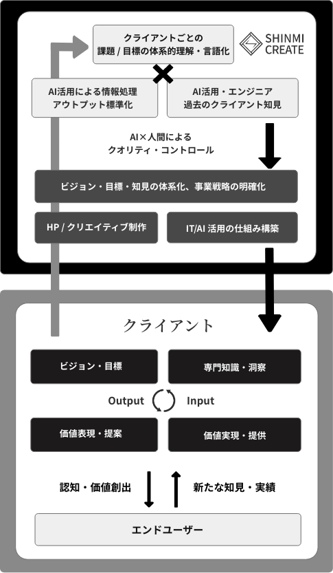 SHINMI CREATEは、専門知識やノウハウを持つ事業者が抱える「価値の可視化」と「事業の体系化」課題を解決する専門支援サービスです。AI技術と人間の洞察力を組み合わせたクオリティ・コントロールにより、クライアント様の持つポテンシャルを最大限に引き出し、持続可能な事業成長を実現します。